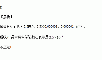 空气质量检测数据pm2.5是值环境空气中,直径小于等于2.5微米的颗粒物,已知1微米=0.000001米,2.5微米用科学记数法可表示为( )米。