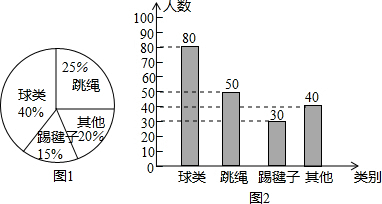 (2)喜欢绳类的人数为200-(80+30+40)=50(人),