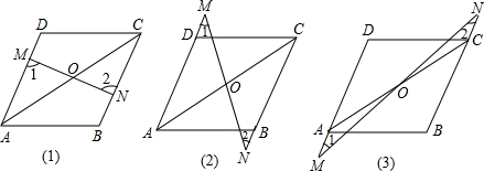 如图(1)已知AB∥CD,AD∥BC,O为AC中点,过O点的直线分别与AD、BC相交于点M,N,那么AM与CN有什么关系?请说明理由.若将过O点的直线旋转至图(2)、(3)的情况时,其它条件不变,那么图(1)中的AM与CN的关系还成立吗?请说明理由.