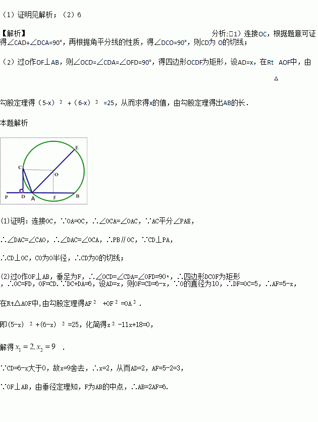 已知直线PA交⊙O于A、B两点,AE是⊙O的直径,点C为⊙O上一点,且AC平分∠PAE,过C作CD⊥PA,垂足为D