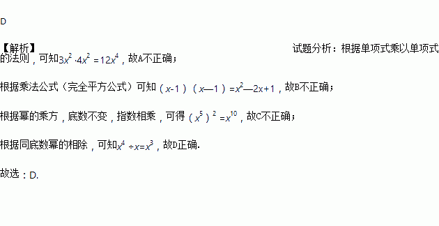 A. 3x2 ·4x2 =12x2 B. (x-1)(x—1)=x2—1 C. (x5)2 =x7 D. x4 ÷x=x3