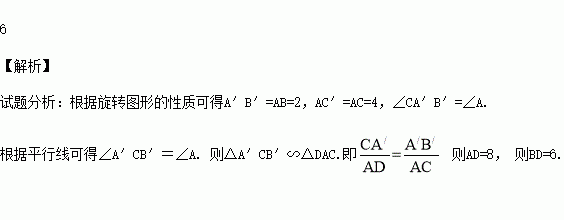 如图,在△ABC中,AB=2,AC=4,将△ABC绕点C按逆时针方向旋转得到△A′B′C,使CB′∥AB,分别延长AB,CA′相交于点D,则线段BD的长为 .
