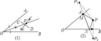 (1)如图(1),已知∠AOB和线段CD,求作一点P,使PC=PD,并且点P到∠AOB的两边距离相等(尺规作图,不写作法,保留作图痕迹,写出结论);