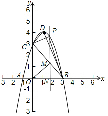 (2)设P点的横坐标为t,纵坐标为-t2+2t+3,利用三角形PBN的面积加上梯形CONP的面积减去三角形OBC的面积表示出三角形PBC的面积即可;