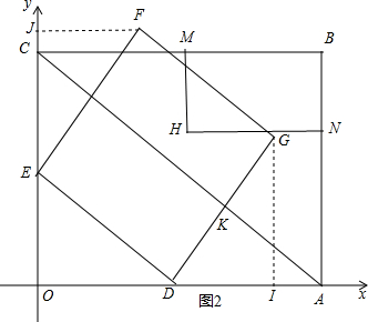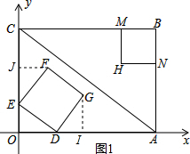 分析 (1)过F作FJ⊥OC于J,过G作GI⊥OA于I,根据题意得到D(4t,0),通过△ODE∽△OAC,得到$\frac{OD}{OA}=\frac{OE}{OC}$,于是得到OE=3t,求得E(0,3t),根据正方形的性质和全等三角形的性质得到FJ=OE=3t,JE=OD=4t,即可得到结果;