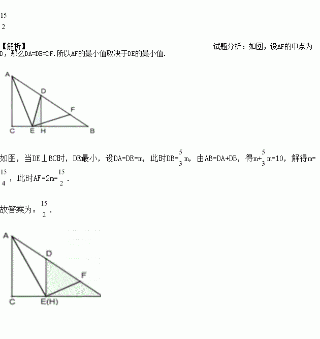 在Rt△ABC中,∠C=90°,AC=6,BC=8,点E是BC边上的动点,连接AE,过点E作AE的垂线交AB边于点F,则AF的最小值为_______