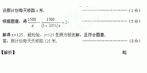 (8分)某市今年计划修建一段全长1500米的景观路,为了尽量减少施工对城市交通的影响,实际施工时,每天的工效比原计划增加20%,结果提前2天完成这一任务,求原计划每天修路多少米?