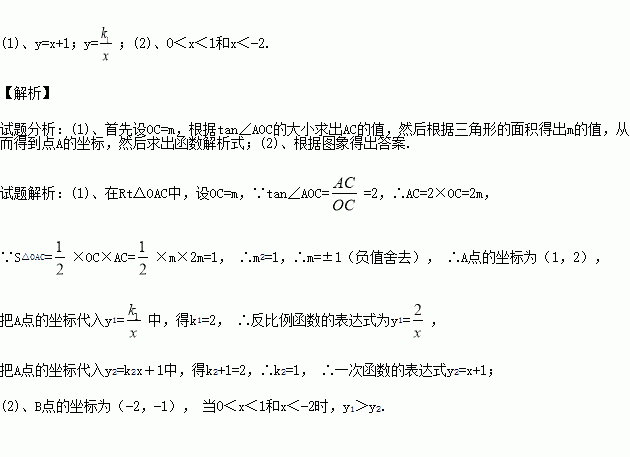 (k1﹥0)与一次函数y2=k2x+1(k2≠0)相交于A、B两点,AC⊥x轴于点C,若△OAC的面积为1,且tan∠AOC=2.