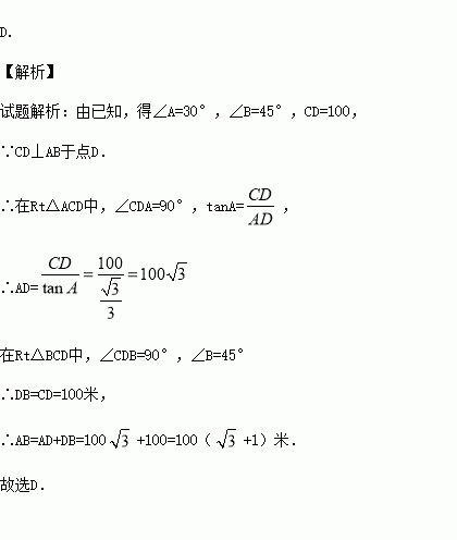 如图,从热气球C处测得地面A、B两点的俯角分别是30°、45°,如果此时热气球C处的高度CD为100米,点A、D、B在同一直线上,则AB两点的距离是( )