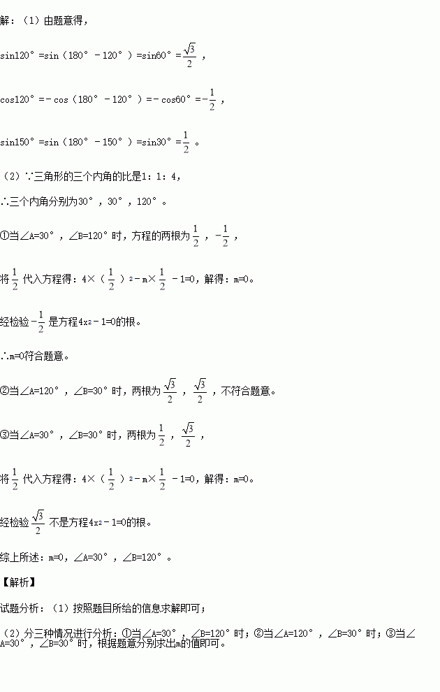(2)若一个三角形的三个内角的比是1:1:4,A,B是这个三角形的两个顶点,sinA,cosB是方程4x2﹣mx﹣1=0的两个不相等的实数根,求m的值及∠A和∠B的大小.