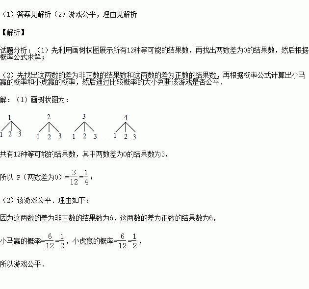 (2)小马与小虎做游戏,规则是:若这两数的差为非正数,则小马赢;否则小虎赢.你认为该游戏公平吗?请说明理由.