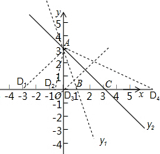 解:(1)把A(0,3),C(3,0)代y2=k2x+b2$\left\{\begin{array}{l}{b=3}\\{3x+b=0}\end{array}\right.$,
