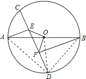 分析 连接AD、BD、OD,由垂径定理得出AD=BD,OD⊥AB,由AAS证明△AED≌△DFB,得出AE=DF,∠DAE=∠BDF,由SAS证明△OAE≌△ODF,得出OE=OF,∠AOE=∠DOF,即可得出结论.