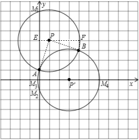 分析 先将y=-$\frac{1}{2}$x2+$\frac{5}{2}$x+1代入y=$\frac{1}{2}$x+1,得-$\frac{1}{2}$x2+$\frac{5}{2}$x+1=$\frac{1}{2}$x+1,解方程求出x的值,进而得到A,B两点的坐标.根据圆周角定理,如果$\widehat{AB}$所对圆心角的度数为90°,且M与点A,B共圆,则∠AMB=45°.由此假设△PAB是以点P为直角顶点的等腰直角三角形(P在AB上方),那么PA=PB=$\frac{\sqrt{2}}{2}$AB=$\sqrt{10}$,再求出P(1,4),以P为圆心,PA为半径画圆交y轴于M,则∠AMB=$\frac{1}{2}$∠APB=45°,此时PM=$\sqrt{10}$,PE=1,ME=$\sqrt{(\sqrt{10})^{2}-1}$=3,则M1(0,7);在AB下方再求出另一个圆心P′(3,0),以P′为圆心,P′A为半径画圆交y轴于M2,交x轴于M3,M4,根据半径为$\sqrt{10}$即可求出M2(0,-1),M3(3-$\sqrt{10}$,0),M4(3+$\sqrt{10}$,0).
