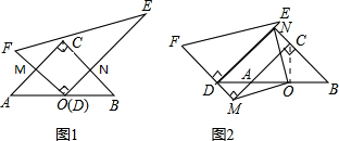 (2)将图(1)中的Rt△DEF沿着射线BA的方向平移至如图(2)的位置,使点D落在BA的延长线上,FD的延长线与CA的延长线垂直相交于点M,BC的延长线与DE垂直相交于点N,连结OM、ON.试判断线段OM、ON的数量关系与位置关系,并写出证明过程.