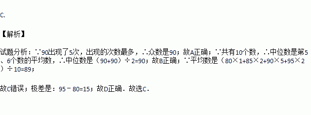 A.众数是90分 B.中位数是90分 C.平均数是90分 D.极差是15分