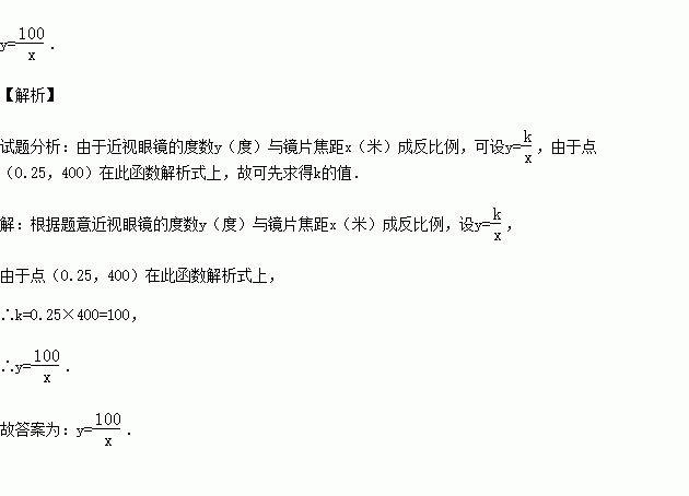 (2007•梅州)近视眼镜的度数y(度)与镜片焦距x(米)成反比例,已知400度近视眼镜镜片的焦距为0.25米,则眼镜度数y与镜片焦距x之间的函数关系式为 .(无需确定x的取值范围)