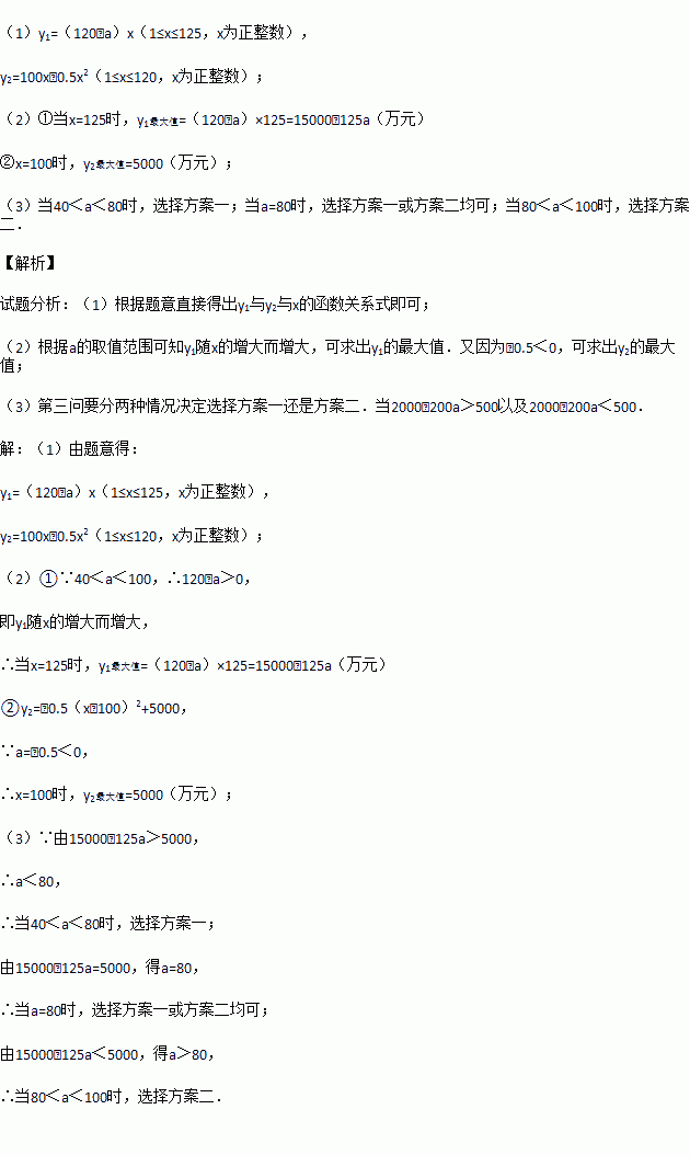 2013年我国多地出现雾霾天气,某企业抓住商机准备生产空气净化设备,该企业决定从以下两个投资方案中选择一个进行投资生产,方案一:生产甲产品,每件产品成本为a元(a为常数,且40<a<100),每件产品销售价为120元,每年最多可生产125万件;方案二:生产乙产品,每件产品成本价为80元,每件产品销售价为180元,每年可生产120万件,另外,年销售x万件乙产品时需上交0.5x2万元的特别关税,在不考虑其它因素的情况下: