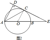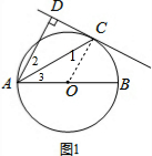 分析 (1)连结OC,如图1,根据切线的性质得OC⊥CD,而AD⊥CD,所以OC∥AD,根据平行线的性质得∠1=∠2,加上∠1=∠2,所以∠2=∠3,于是可判断AC平分∠DAB;
