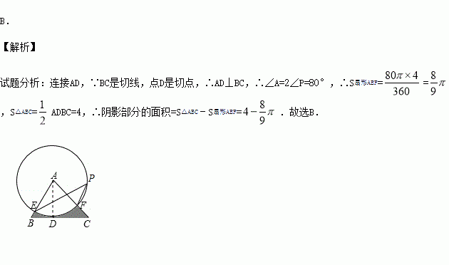 在△ABC 中,BC =4,以点A为圆心、2为半径的⊙A与BC相切于点D,交AB于E,交 AC于F,点P是⊙A上的一点,且∠EPF=40°,则图中阴影部分的面积是( )