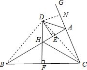 分析 根据线段垂直平分线的性质得到BH=CH,BF=CF,由于CH>CF,于是得到BH>CF,故①错误;根据角平分线的性质和三角形的外角的性质得到∠GAD=$\frac{1}{2}∠$GAB=$\frac{1}{2}$(∠ABC+∠ACB),由于∠ACB>∠HCB,于是得到∠GAD$>\frac{1}{2}$(∠B+∠HCB),故②错误;过D作DN⊥AC,垂足为N,连接DB、DC,推出DN=DF,DB=DC,根据HL证Rt△DBF≌R△DCN,推出BF=CN,根据HL证Rt△DFA≌Rt△DNA,推出AN=AF,于是得到BE=AC+AN=AC+AE,即BE-AC=AE,故③正确;根据余角的性质得到∠ABC=∠HDE,故④错误.