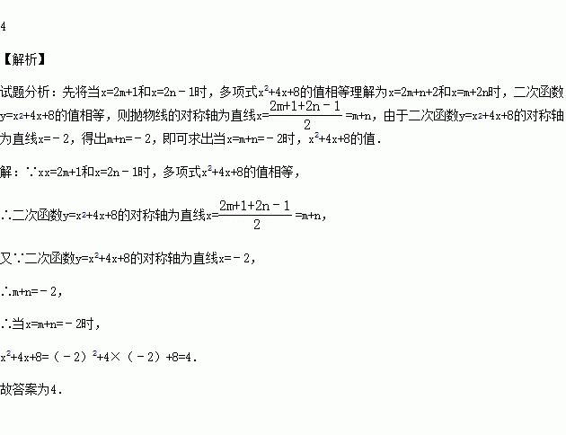 (2015秋•嵊泗县期中)已知当x=2m+1和x=2n﹣1时,多项式x2+4x+8的值相等,且m﹣n+1≠0,则当x=m+n时,多项式x2+4x+8的值= .