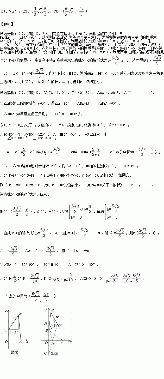 (Ⅲ)在(Ⅱ)的条件下,边OA上 的一点P旋转后的对应点为P′,当O′P+BP′取得最小值时,求点P′的坐标(直接写出结果即可)