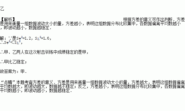 在一次射击训练中,甲、乙两人各射击10次,两人10次射击成绩的平均数均是9.1环,方差分别是S甲2=1.2,S乙2=1.6,则关于甲、乙两人在这次射击训练中成绩稳定的 _____. (填“甲或乙”)