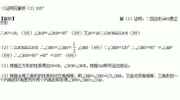 在正方形ABCD中,AC为对角线,E为AC上一点,连接EB、ED.(1)求证:△BEC≌△DEC;(2)延长BE交AD于F,当∠BED=120?时,求∠EFD的度数.