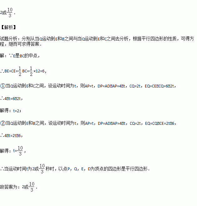 如图,在梯形ABCD中,AD∥BC,AD=4,BC=12,E是BC的中点.点P以每秒1个单位长度的速度从点A出发,沿AD向点D运动;点Q同时以每秒2个单位长度的速度从点C出发,沿CB向点B运动.点P停止运动时,点Q也随之停止运动.当运动时间为 秒时,以点P,Q,E,D为顶点的四边形是平行四边形.