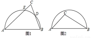 如图AB是半圆的直径,图1中,点C在半圆外;图2中,点C在半圆内,请仅用无刻度的直尺按要求画图.(1)在图1中,画出△ABC的三条高的交点;(2)在图2中,画出△ABC中AB边上的高.(不必写出作图过程,但必须保留作图痕迹)