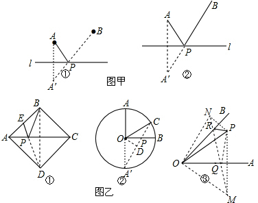 Ìõ¼þ£ºÈçͼ¼×¢Ù£¬A£¬BÊÇÖ±ÏßlͬÅÔµÄÁ½¸ö¶¨µã£®ÎÊÌ⣺ÔÚÖ±ÏßlÉÏÈ·¶¨Ò»µãP£¬Ê¹PA+PBµÄÖµ×îС£®