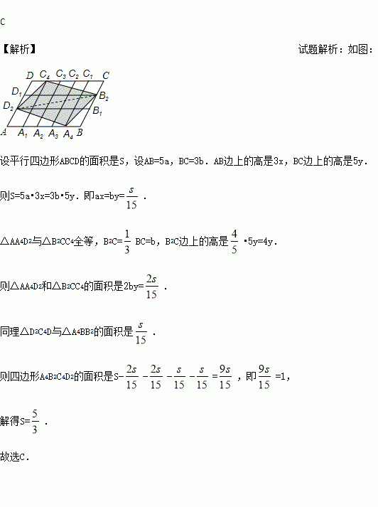 如图,在平行四边形中,点A1,A2,A3,A4和C1,C2,C3,C4分别是ABCD的五等分点,点B1,B2和D1,D2分别是BC和DA的三等分点,已知四边形A4B2C4D2的面积为2,则平行四边形ABCD的面积为( )
