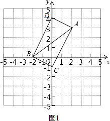 解答 解:(1)如图1所示:∵四边形ADBC是矩形,∴CD=AB=$\sqrt{{3}^{2}{+4}^{2}}$=5,∵OD=1,∴OD=4,∴D(0,4),故答案为:(0,4);(2)如图2所示: