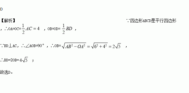已知平行四边形ABCD的对角钱AC与BD相交于点O,BD⊥AC,若AB=6,AC=8,则对角线BD的长是( )