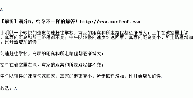 早上小明以一个较快的速度匀速赶往学校,上午在教室里上课,中午以较慢的速度匀速回家,下列图象能大致反应这一过程的是( )