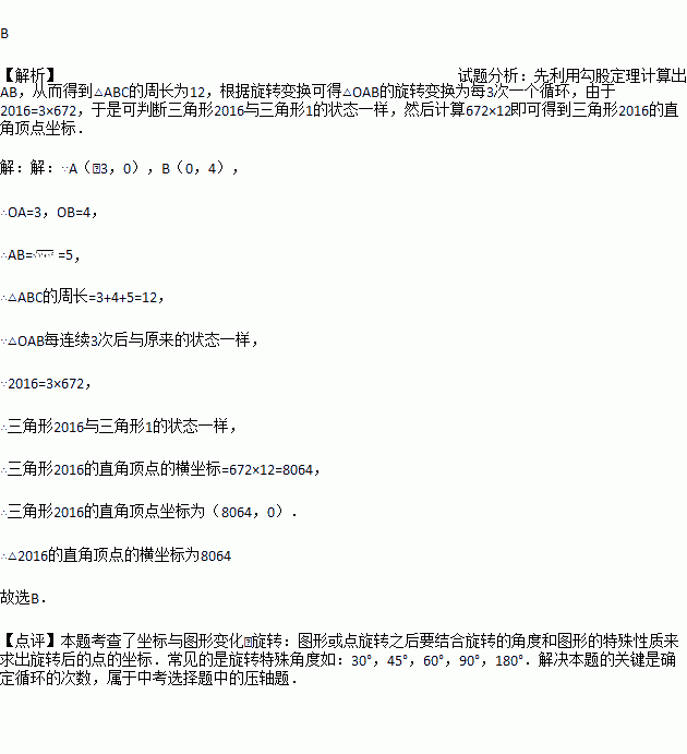 如图,在直角坐标系中,已知点A(-3,0)、B(0,4),对△OAB连续作旋转变换,依次得到△1、△2、△3、△4…,则△2016的直角顶点的坐标为 ( )