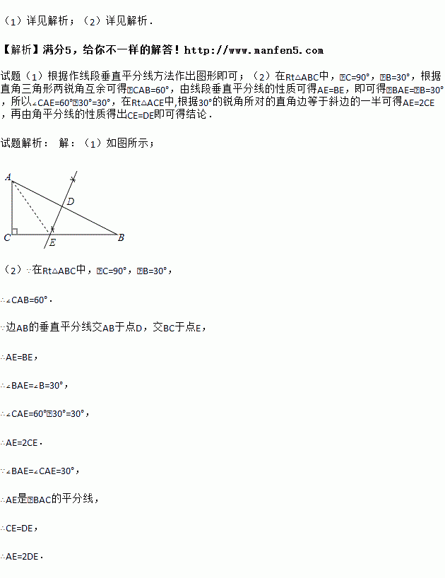 (1)作边AB的垂直平分线交AB于点D,交BC于点E(尺规作图,不写作法,保留作图痕迹).