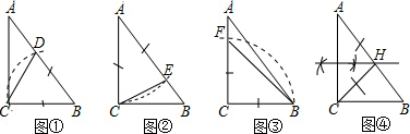 分析:①以B为圆心,BC长为半径画弧,交AB于点D,△BCD就是等腰三角形;②以A为圆心,AC长为半径画弧,交AB于点E,△ACE就是等腰三角形;③以C为圆心,BC长为半径画弧,交AC于点F,△BCF就是等腰三角形;④作AC的垂直平分线交AB于点H,△ACH就是等腰三角形.