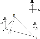 分析 作BC⊥OA于点C,根据题意得∠MAB=45°,∠NOA=60°,∠NOB=30°,OA=60海里.由AM∥ON,求出∠BAO=∠MAO-∠MAB=75°,根据三角形内角和定理得出∠ABO=180°-∠BAO-∠AOB=75°,利用等角对等边得到OB=OA=60海里,在直角△OBC中根据含30°角的直角三角形的性质得出BC=$\frac{1}{2}$OB=30海里,OC=$\sqrt{3}$BC=30$\sqrt{3}$海里,那么AC=OA-OC=(60-30$\sqrt{3}$)≈8.04海里,然后根据勾股定理求出AB=$\sqrt{A{C}^{2}+B{C}^{2}}$≈31.1海里.