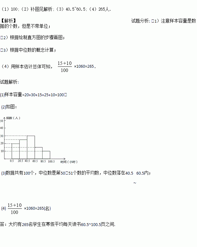 (4)若该年级有学生1060人,那么大约有多少学生在寒假平均每天读书60.5~100.5页之间?