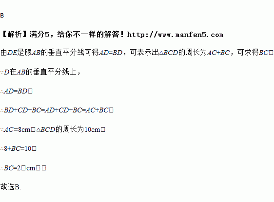 在等腰三角形ABC中,AB=AC=8cm,腰AB的垂直平分线交另一腰AC于D,若△BCD的周长为10cm,则底边BC的长为( )