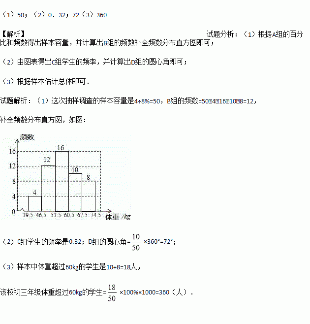 ijУΪÁËÁ˽â³õÈýÄê¼¶1000ÃûѧÉúµÄÉíÌ彡¿µÇé¿ö£¬´Ó¸ÃÄê¼¶Ëæ»ú³éÈ¡ÁËÈô¸ÉÃûѧÉú£¬½«ËûÃǰ´ÌåÖØ£¨¾ùΪÕûÊý£¬µ¥Î»£ºkg£©·Ö³ÉÎå×飨A£º39.5¡«46.5£»B£º46.5¡«53.5£»C£º53.5¡«60.5£»D£º60.5¡«67.5£»E£º67.5¡«74.5£©£¬²¢ÒÀ¾Ýͳ¼ÆÊý¾Ý»æÖÆÁËÈçÏÂÁ½·ùÉв»ÍêÕûµÄͳ¼ÆÍ¼£®
