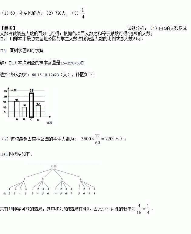£¨3£©´ÓÑ¡ÏîΪ¡°D(ÉÁÖ¹«Ô°)¡±µÄѧÉúÖгéÈ¡ÁËСÃ÷ºÍС¾üÁ½ÈË×öÓÎÏ·£¬ÓÎÏ·¹æÔòÈçÏ£ºÃ¿ÈË´Ó1,2£¬¡£¬8ÖÐÈÎÒâÑ¡ÔñÒ»¸öÊý×Ö£¬È»ºóÁ½È˸÷ת¶¯Ò»´ÎÈçͼËùʾµÄתÅÌ£¨×ªÅ̱»·ÖÎªÃæ»ýÏàµÈµÄËĸöÉÈÐΣ©£¬Á½ÈËת³öµÄÊý×ÖÖ®ºÍµÈÓÚËÑ¡ÔñµÄÊý£¬Ë¾Í»ñʤ£»ÈôС¾üÑ¡ÔñµÄÊýÊÇ5£¬ÓÃÁбí»ò»Ê÷״ͼµÄ·½·¨ÇóËû»ñʤµÄ¸ÅÂÊ.