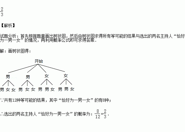 (2015秋•南京期末)某校学生会正筹备一个“迎新年”文艺汇演活动,现准备从4名(其中两男两女)节目主持候选人中,随机选取两人担任节目主持人,请列举出所有等可能的不同的选取搭配方法,并求选出的两名主持人“恰好为一男一女”的概率.