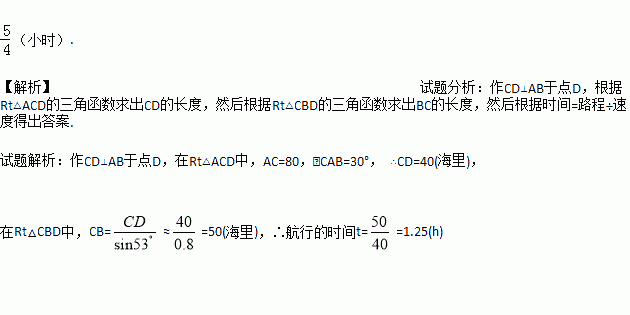 一艘观光游船从港口A处以北偏东60°的方向出港观光,航行80海里至C处时发生了侧翻沉船事故,立即发生了求救信号,一艘在港口正东方向B处的海警船接到求救信号,测得事故船在它的北偏东37°方向,马上以40海里/时的速度前往救援,求海警船到达事故船C处所需的大约时间.(参考数据:sin53°≈0.8,cos53°≈0.6)