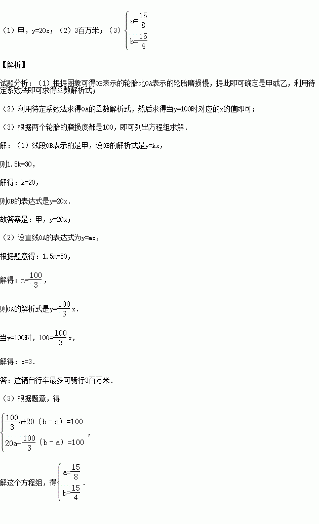 (3)爱动脑筋的小聪,想了一个增大自行车骑行路程的方案:如图(2),当自行车骑行a百万米后,我们可以交换自行车的前、后轮胎,使得甲、乙两个轮胎在b百万米处,同时报废,请你确定方案中a、b的值.