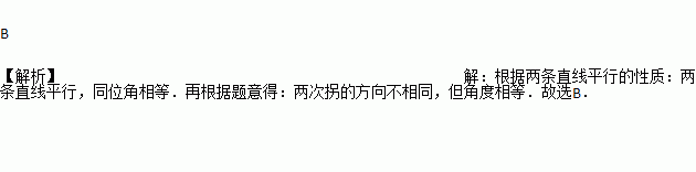 一辆汽车在笔直的公路上行驶,两次拐弯后,仍在原来的方向上平行前进,那么两次拐弯的角度是( )