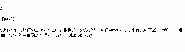 如图,已知∠MON =60°,OP是∠MON的角平分线 ,点A是OP上一点,过点A作ON的平行线交OM于点B,AB=4.则直线AB与ON之间的距离是( )