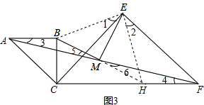 (3)延长BM交CF于H,连结EB、EH,证明△ABM≌△CHM(ASA),△BCE≌△HFE(SAS),利用全等三角形的性质得出EM⊥BM,BM=ME.